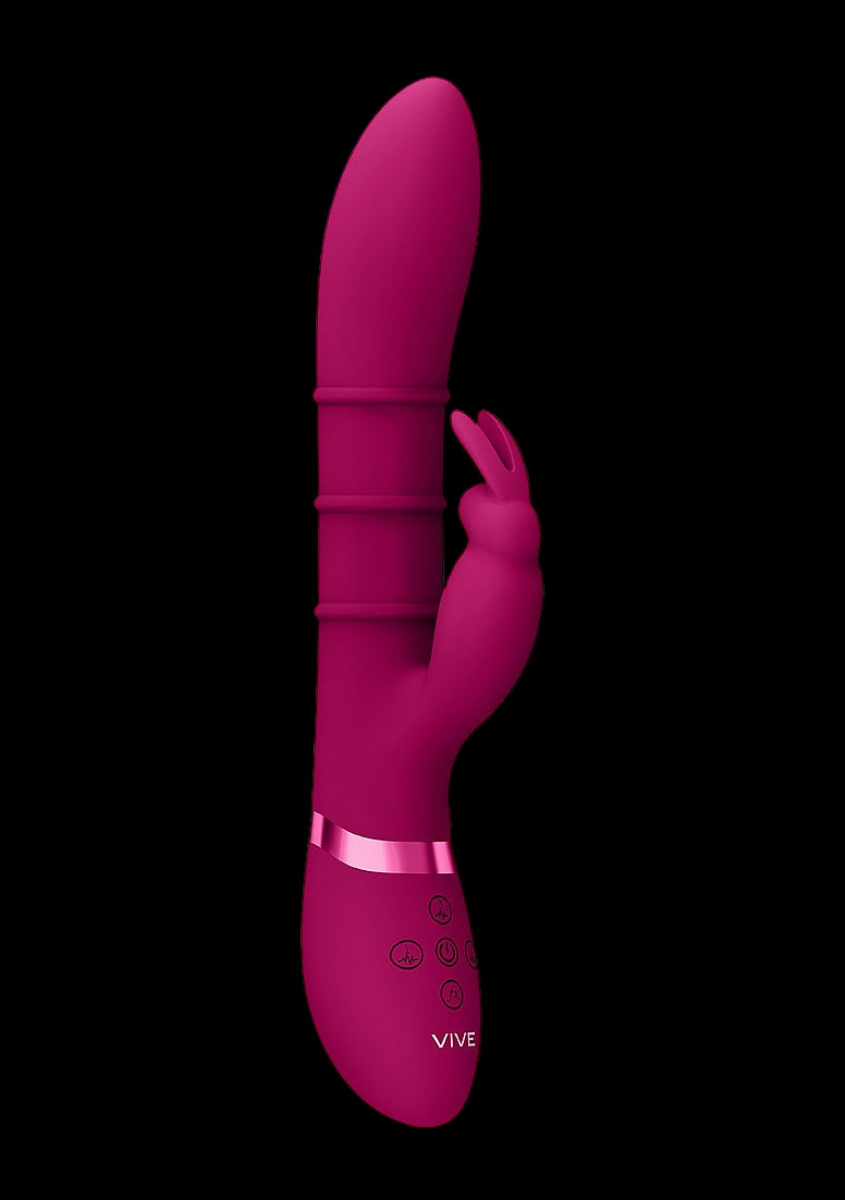 The high class VIVE brand stands for ultimate stimulation through continuous innovation! This top of the range G-spot Rabbit Vibrator boasts a unique feature that will make your toes curl in ecstasy! It has a set of 3 stimulating rings integrated into the smooth, medical grade, silicone shaft that moves up and down for an internal massage like no other. The rings come with 10 different speed modes, while the G-spot stimulator and the Rabbit stimulator both have 10 different vibration modes which give you a mind blowing 1,000 distinct settings to choose from.